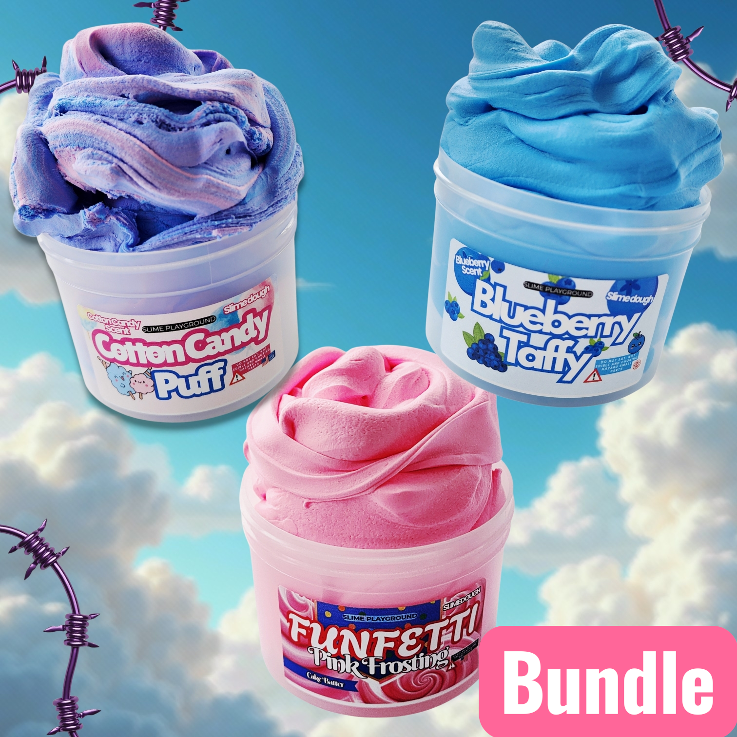 3 amazing slimes - Cotton Candy Puff, Blueberry Taffy and Funfetti.
